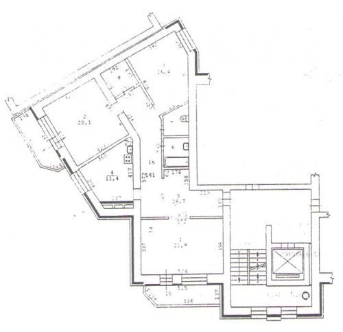 Просторная квартира оригинальной планировки общей площадью 108 кв.м., с большим холлом - 26 кв.м. и просторными комнатами: 22,8 кв.м., 20 кв.м. и 16,4 кв.м.