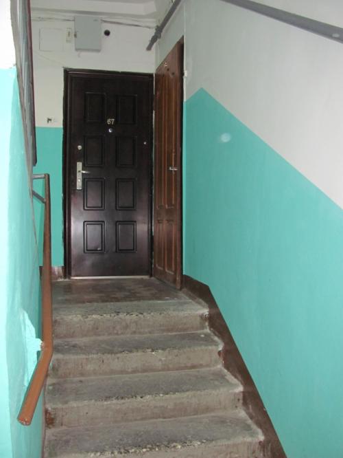 Чистый подъезд с большими пластиковыми окнами, новые почтовые ящики, дополнительные деревянные двери в подъезд.